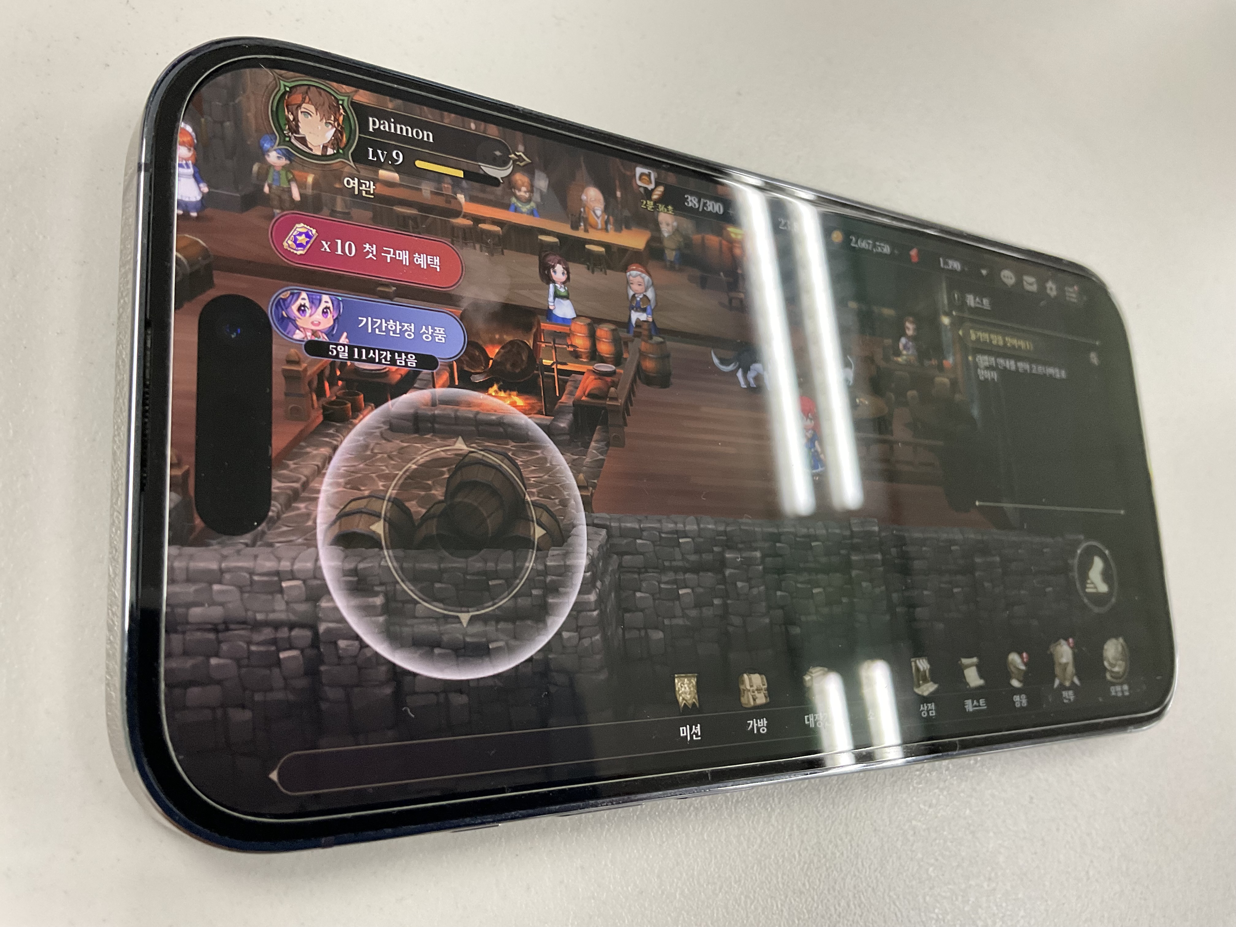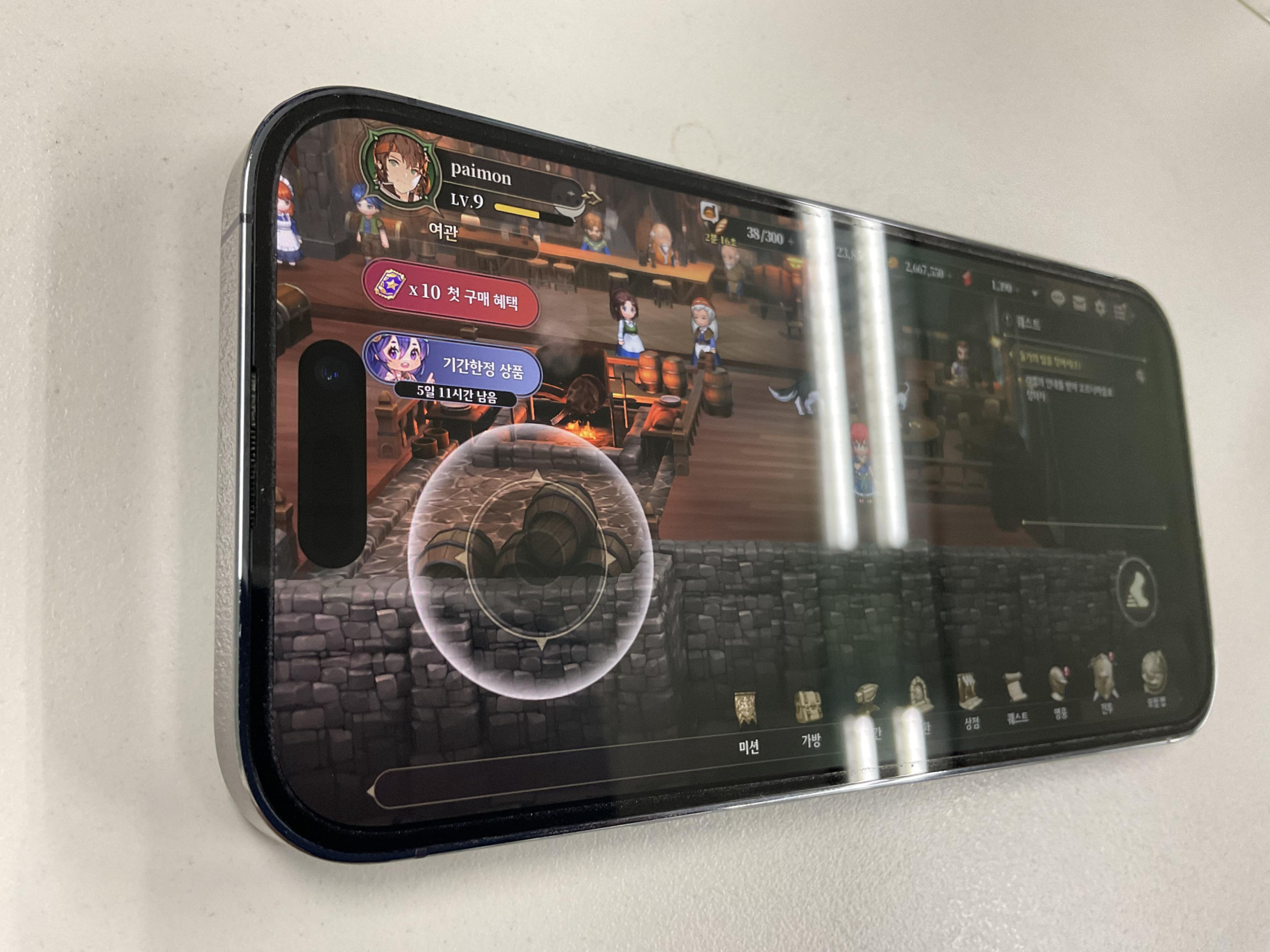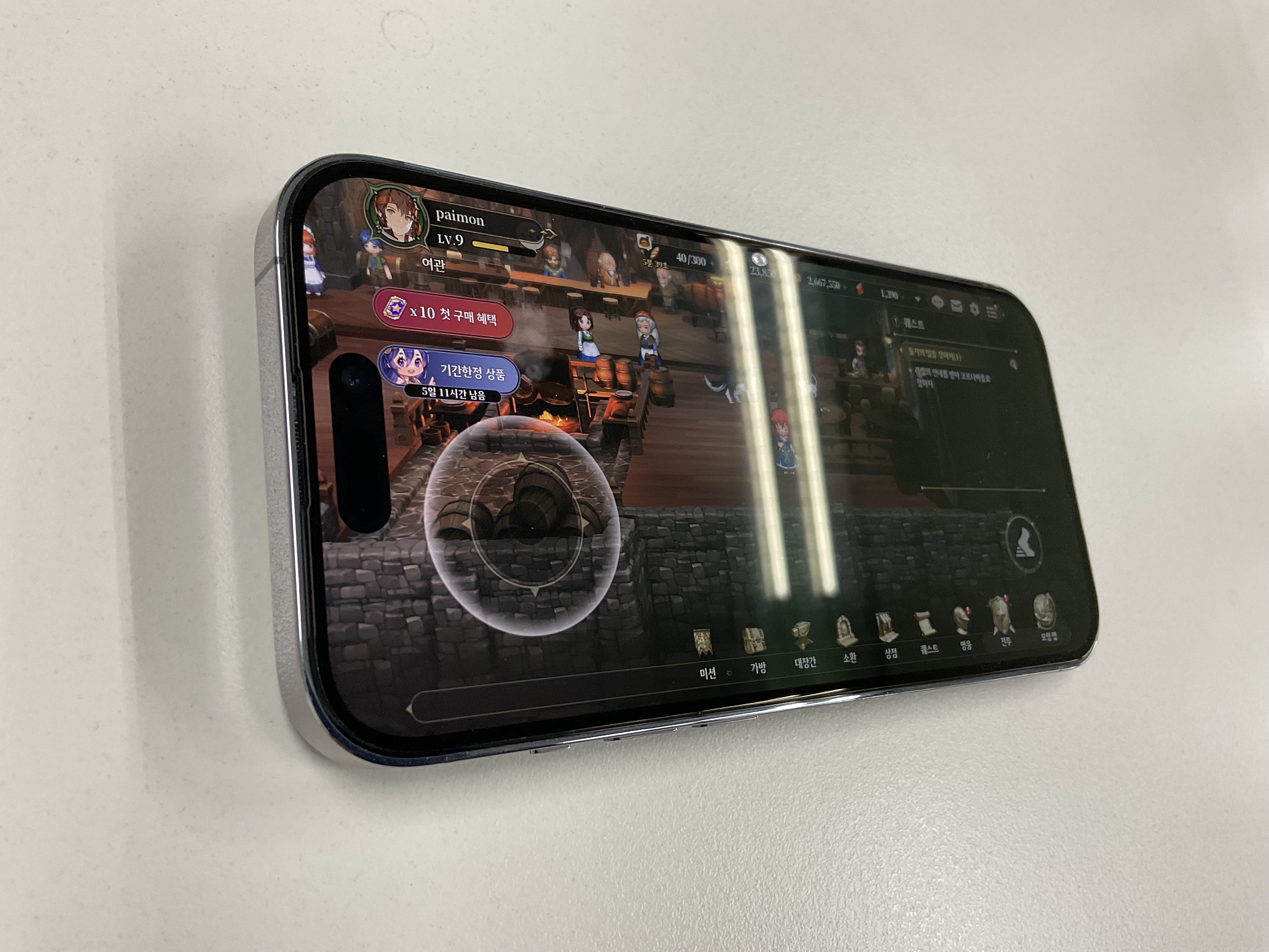 어쨌든 이렇게 붙일 준비는 되었습니다. 그런데 이 강화유리 자체가 AR 코팅이 되어 있는 강화유리로 알고 신청을 하였는데 이 강화유리가 다른 강화유리와 어떻게 다른지 보여드릴 수 있는 방법에 대해 고민이 됐습니다. 전 따로 빛 반사 등을 체크할 수 있는 기계가 없었으니까요. 그러다가 평상시에 즐기는 게임화면에 형광등이 비치던 것을 생각하고 형광등 빛이 어떻게 비치는지를 보여드리면 되겠다는 생각에 다다랐습니다. 조금 부실할 수 있지만 이 부분은 먼저 양해 말씀을 구합니다(...). 먼저 아래 사진은 왼쪽은 기존에 사용하던 B 사의 강화유리를 부착한 상태이고 우측은 아무것도 없이 떼어낸 있는 그대로의 액정 상태입니다. 크게 차이가 없는 것 같으면서도 실제 B사의 강화유리 쪽이 조금 더 빛이 번지는 느낌이었습니다. 혹시 그런데 영웅전설 하시는 분 계신가요? 전 요금 구원자 어빈을 뽑아서 기분이 좋습니다(?!)