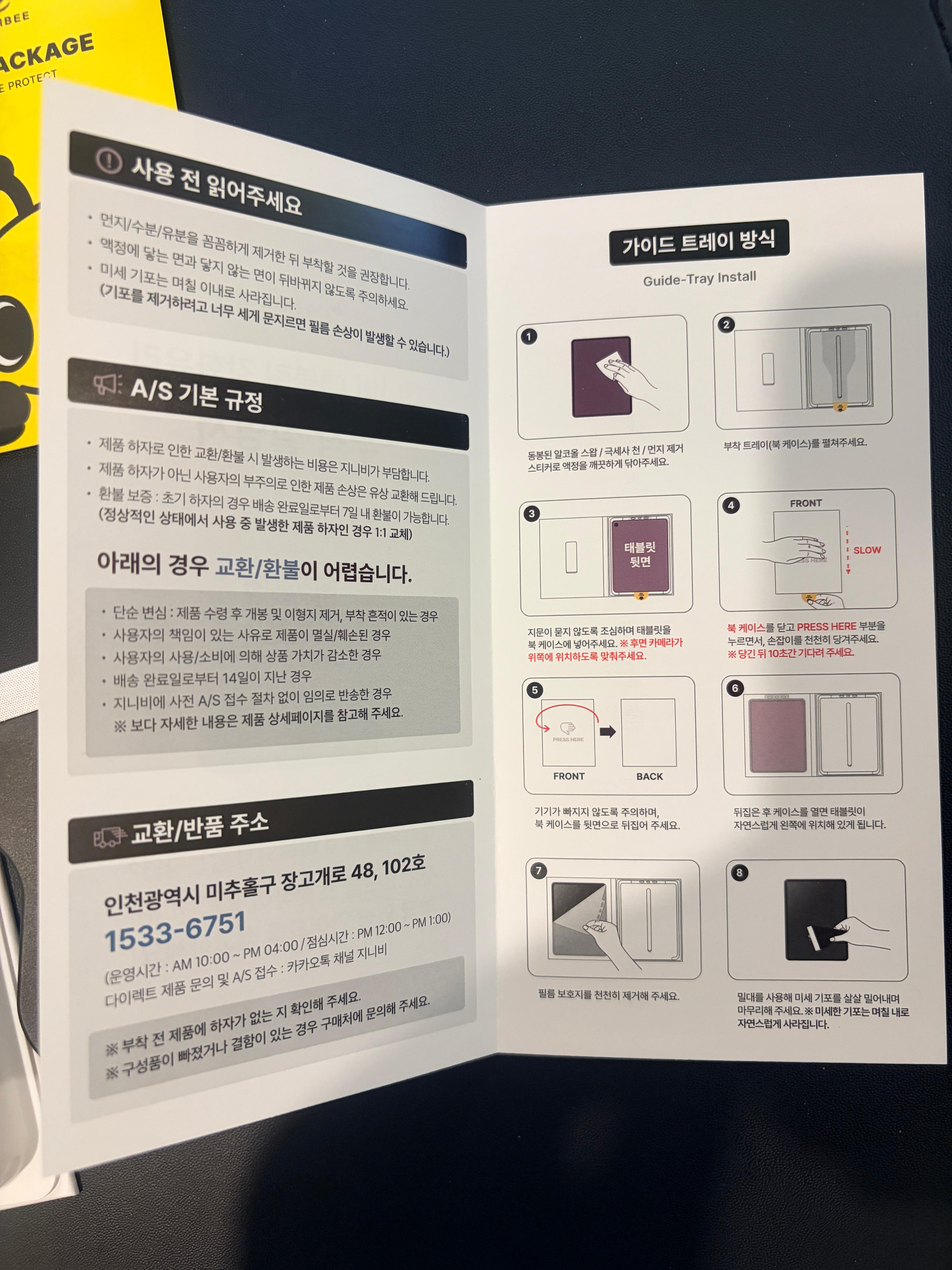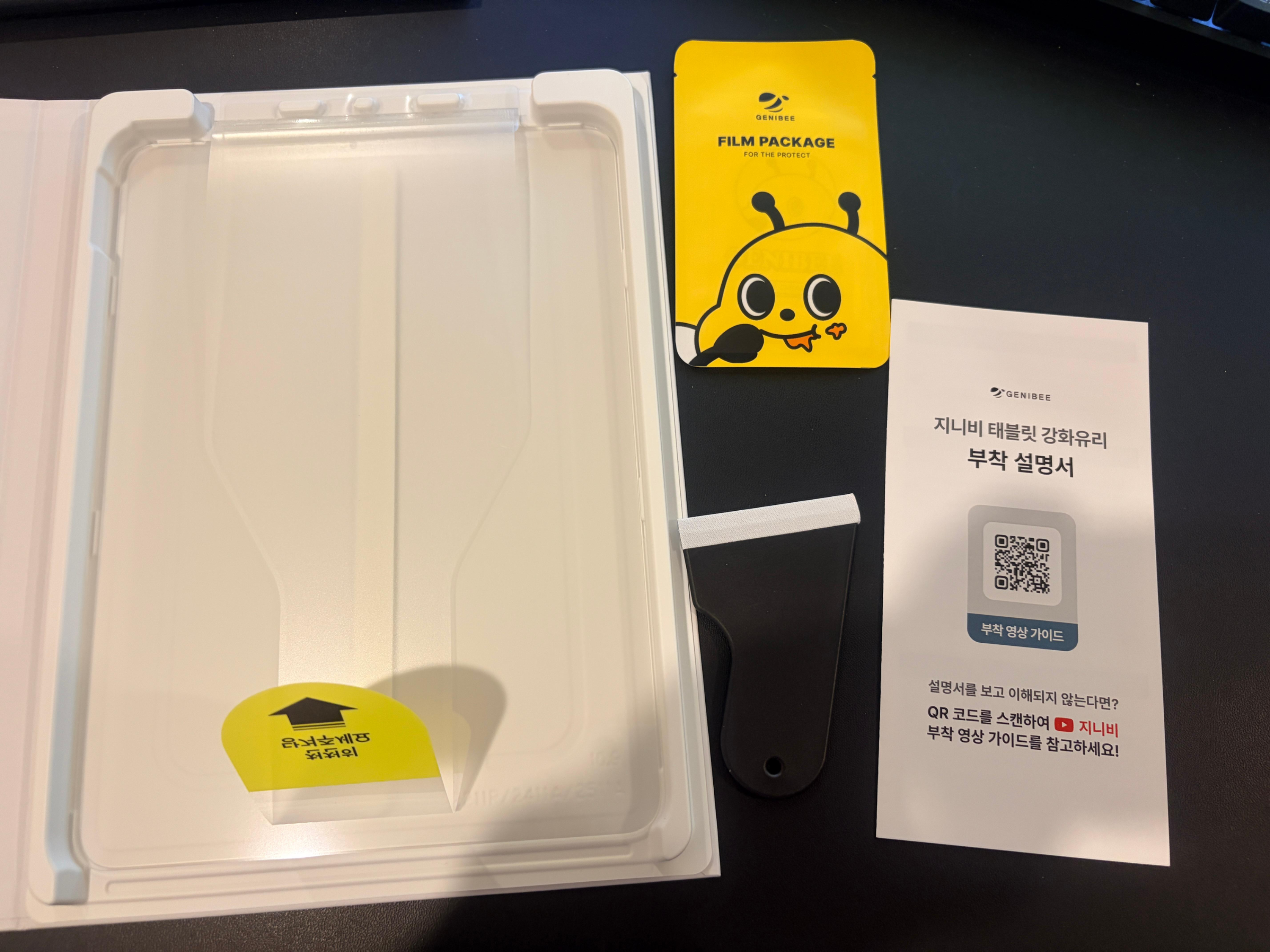 우선 박스 자체는 상당히 단단했다. 그리고 그 이유는 개봉해 보고 바로 알 수 있었다. 아래와 같이 박스형 가이드 툴과 함께 부착에 필요한 밀대 등이 같이 첨부가 되어 있었으니 케이스가 단단할 수 밖에. 가이드 툴에 대한 사용 방법은 부착 설명서에도 나와 있었지만 부착영상 가이드 QR로 접속해 보면 유튜브 재생 리스트로 이동이 되는데, 영상을 보니 크게 어려워 보이지는 않았다. 다만 이동 시 리스트로 이동이 되는데 리스트가 아니라 해당 제품의 영상으로 바로 이동이 되면 더 좋을 것 같다는 생각이 들었다. 그리고 동봉된 먼지제거 스티커도 지니비 캐릭터가 귀엽게 프린팅 되어 있어 보기에 좋았다. 사실 동봉되는 먼지 제거 스티커 등이야 그냥 스티커 역할만 잘하면 되긴 하지만 이런 깨알 같은 디테일이 제품의 완성도 및 수령 시 만족도를 늘려 주는 것 같다.