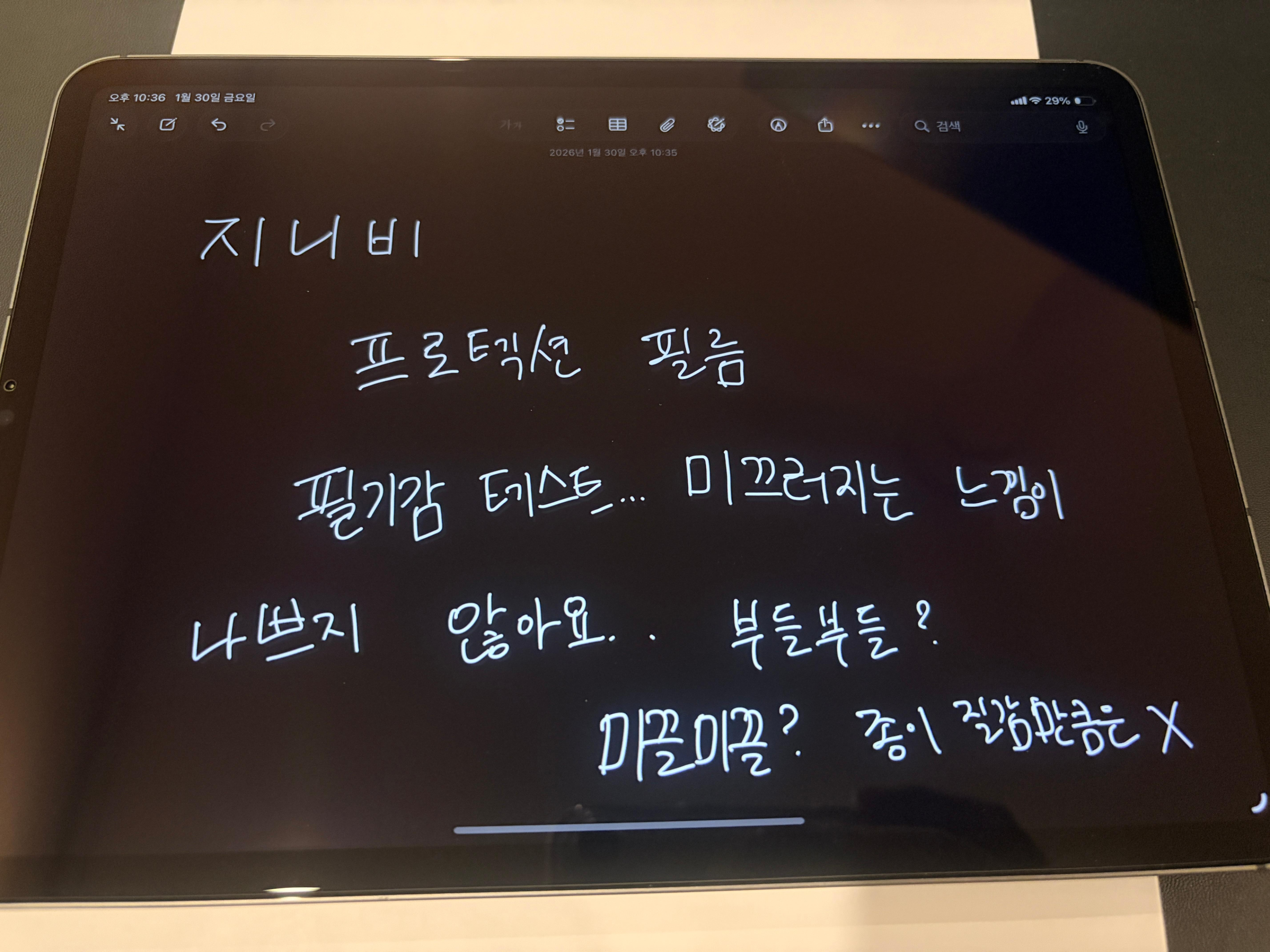 오래간만에 강화유리를 부착해서 설레는 마음으로 여기 저기서 사용 해보았다. 확실히 아래 사진에서도 보이다시피 천장에 있는 등의 빛이 반사가 심하지 않은 것을 볼 수 있다. 그리고 확실히 그냥 사용할 때와 달리 지문이 많이 묻지 않아서 시인성도 본의 아니게(?) 좋아진 것을 느꼈다. 그리고 이어서 펜을 사용해 보는데 확실 히 강화 유리를 붙이고 나니 애플펜슬로 쓸 때 미끌미끌한 느낌이 강해졌다. 다만 그 미끄러지는 느낌이 '어우 이거 못써먹겠네'라는 정도는 아니었다. 평소에 아무것도 붙이지 않고 사용하던 입장에서는 그냥 좀 미끌 거리는데 딱히 쓰는데 문제는 없는 느낌이라고 할 수 있겠다. 그렇기에 반대로 말하자면 평소 종이 질감 필름을 사용하시는 분들은 절대 못쓸 필기감이기도 하다. 다만 종이 질감 필름을 사용하시는 분들이 갑자기 AR 강화 유리를 선택할 일은 없을 테니 애초에 타겟층이 다른 제품이라고 봐야겠다.
